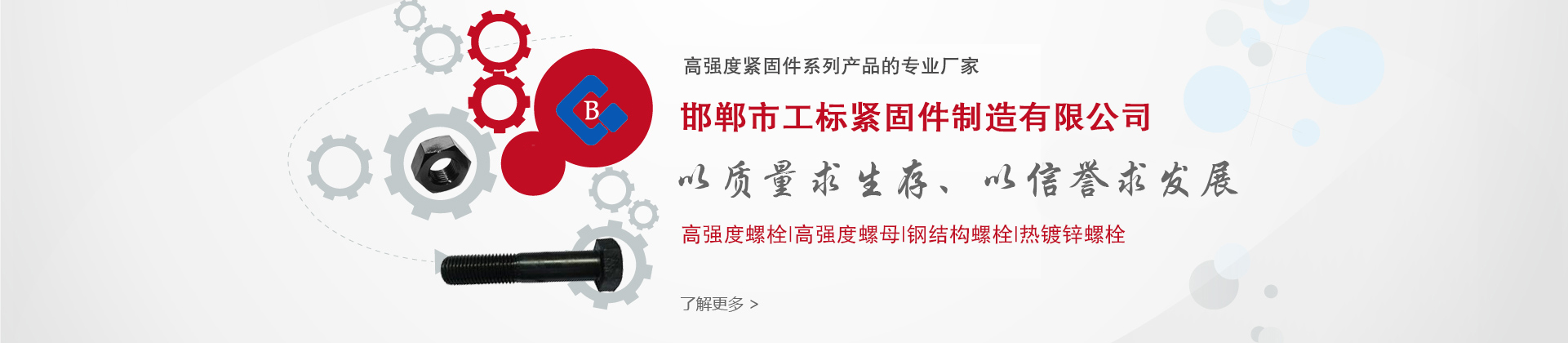 邯鄲市工標緊固件制造有限公司位于標準件生產基地---河北省永年縣,是一家專業研發及生產鋼高強度緊固件系列產品的專業廠家。工標緊固件公司擁有各類自動化生產及檢測設備,采用進口及大型鋼廠原材料,以現代化企業制度為運營機制,保持產品質量。 我們主要產品有:高強度螺栓、高強度螺母、鋼結構螺栓、扭剪型螺栓、塔吊螺栓、高強度加長螺栓、焊釘,鋼結構用大六角頭高強度螺栓連接副、鋼結構用扭剪型高強度螺栓連接副、鋼網架螺栓球節點用高強度螺栓、高強度內外六角螺栓系列,玻璃幕墻T型螺栓,T型槽螺栓,地腳螺栓,雙頭螺栓,四方頭螺栓,各種異型螺栓、熱鍍鋅螺栓、達克羅螺栓,國內外標準各類高強度緊固件,可訂做各種高強度異型件。產品廣泛用于航天、建筑、交通、電力、軍工等行業,經過多年發展,產品質量與售后服務得到了客戶及業界人士的好評!